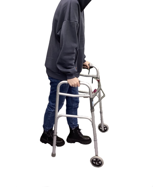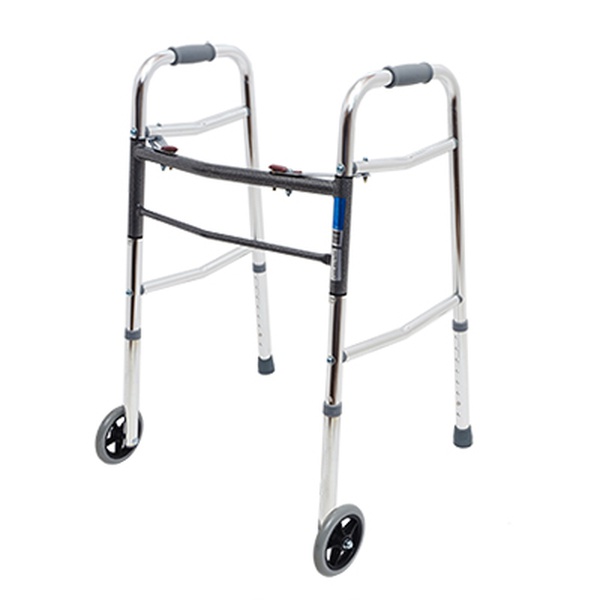 Складные ходунки с двумя передними колесами, жесткой фиксацией с помощью центральной кнопки, регулируемые по высоте.